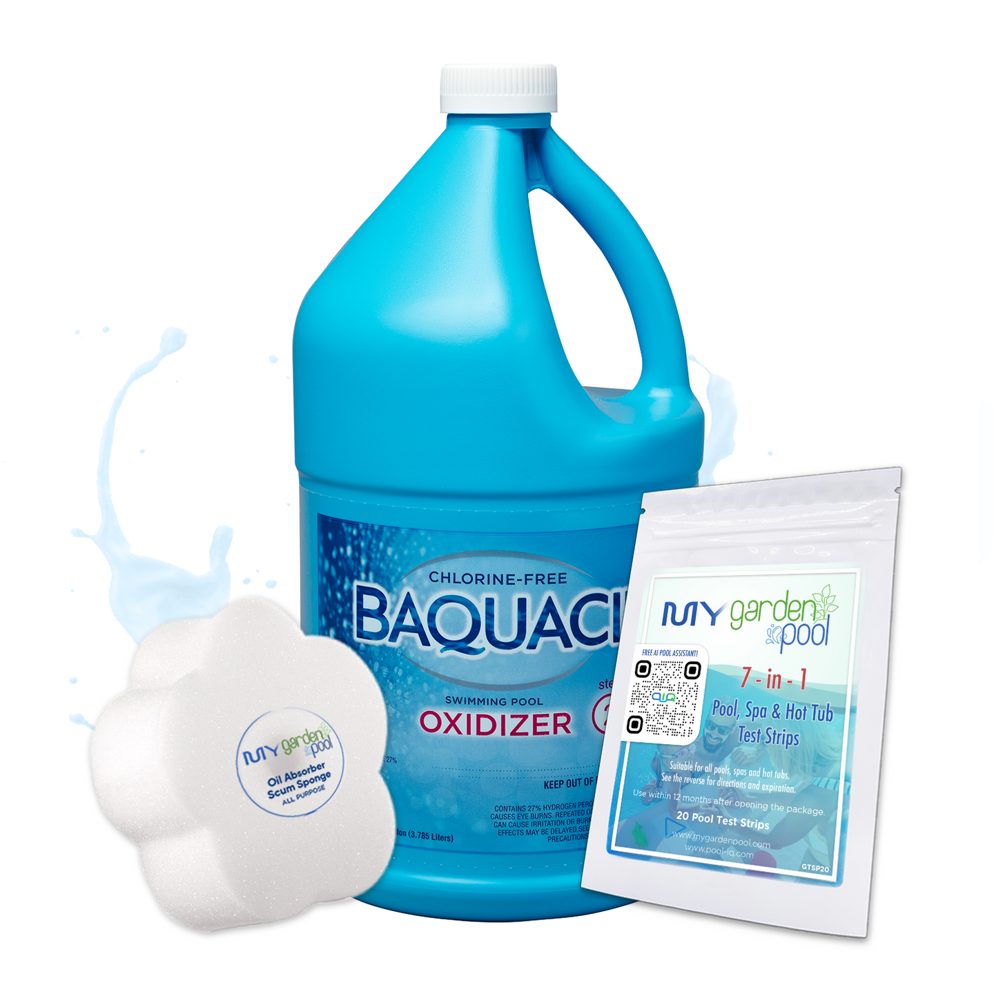 BAQUACIL Swimming Pool Oxidizer 1 Gallon – Non-Chlorine Pool Shock – Revives and Refreshes Pool Water – Includes 2 Scum Socks and 7-in-1 Test Strips