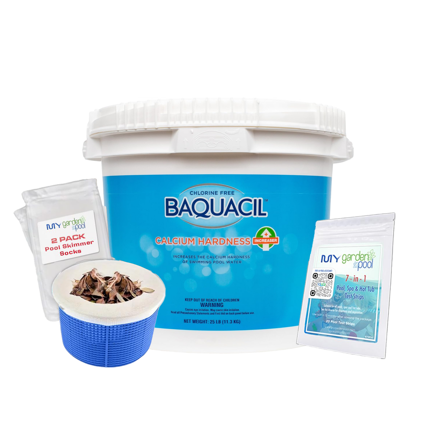 BAQUACIL Calcium Hardness Increaser – 25 lb Pail – 93% Pure Calcium Chloride – Raises Hardness & Protects Pool Surfaces – Bonus Test Strips & Scum Socks