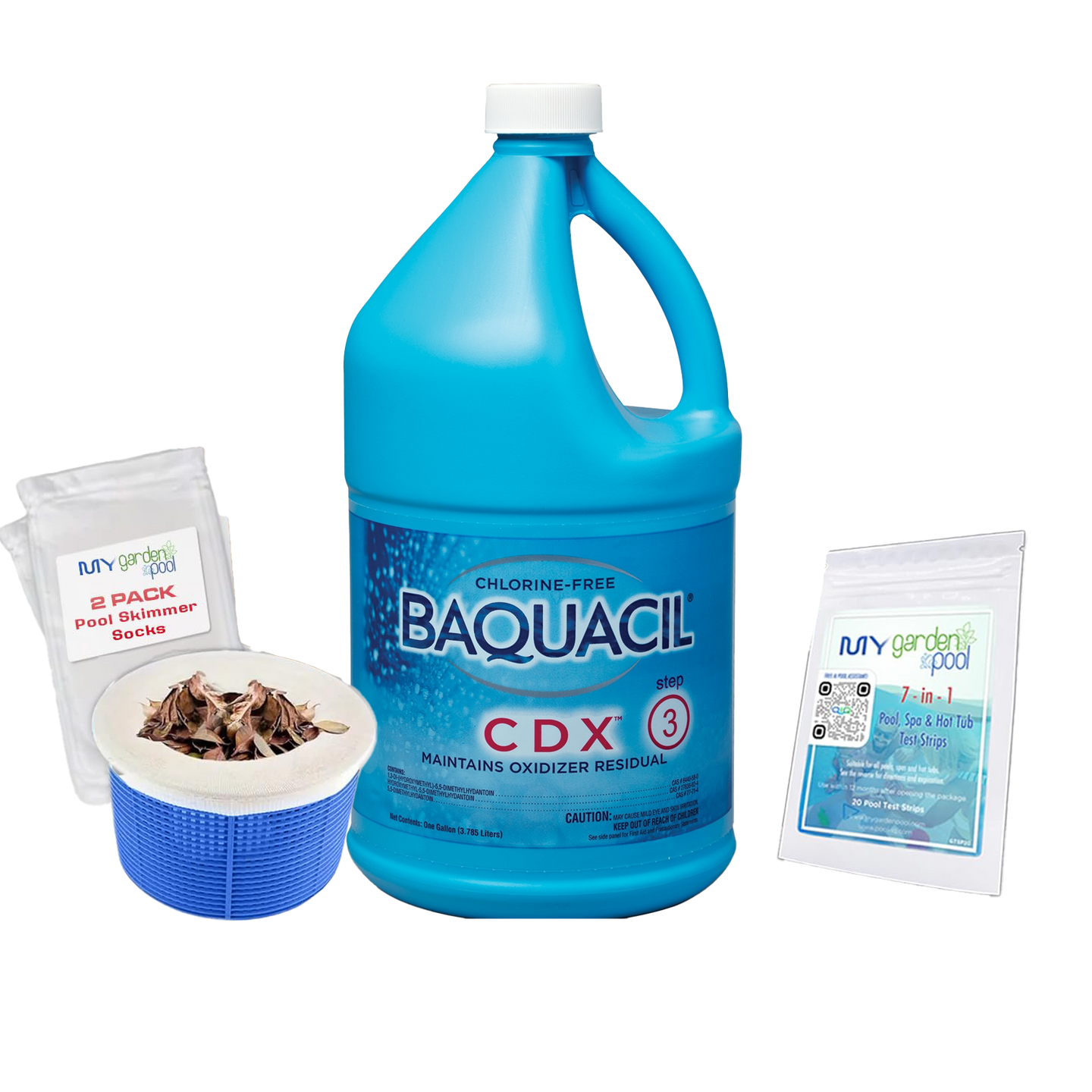 BAQUACIL CDX 64 fl oz – Step 3 in the BAQUACIL 3-Step System – Helps Maintain Oxidizer Levels & Water Clarity – Includes Scum Socks & Test Strips