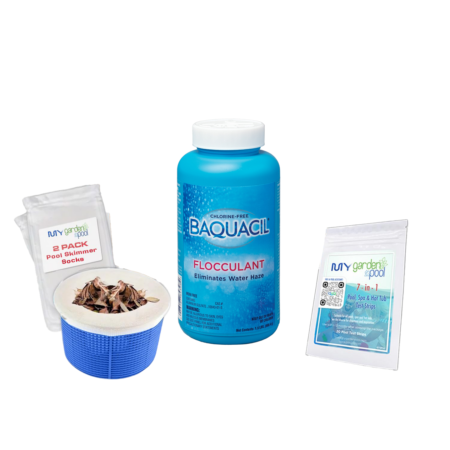 BAQUACIL Flocculant 1.5 lb – Rapid Pool Clarifier for Cloudy Water – Binds Debris for Easy Vacuum Removal – Bonus Test Strips & Scum Socks