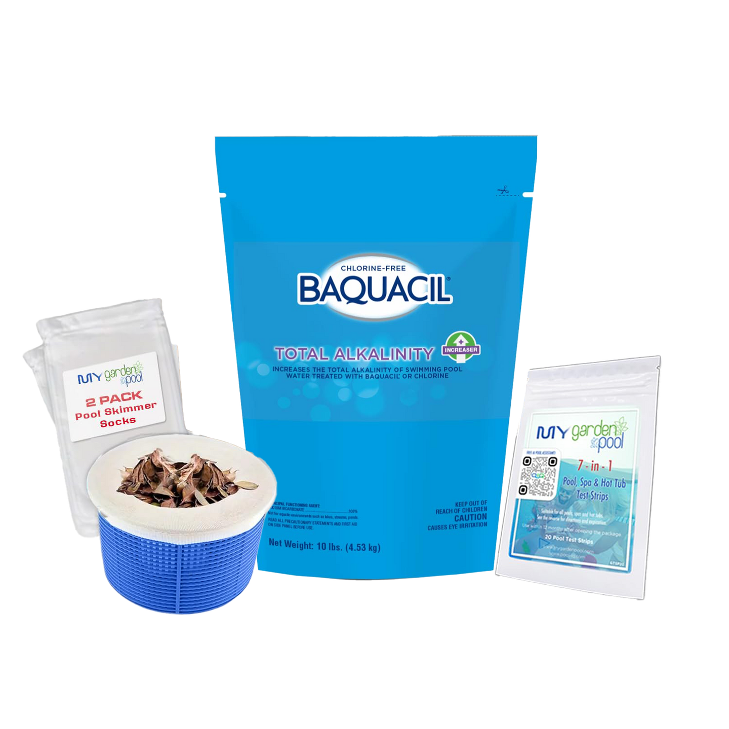 BAQUACIL Total Alkalinity Increaser – 10 lb Bag – Balances pH Stability & Prevents Corrosion – Chlorine-Free Pool Compatible – Includes Scum Socks & Test Strips