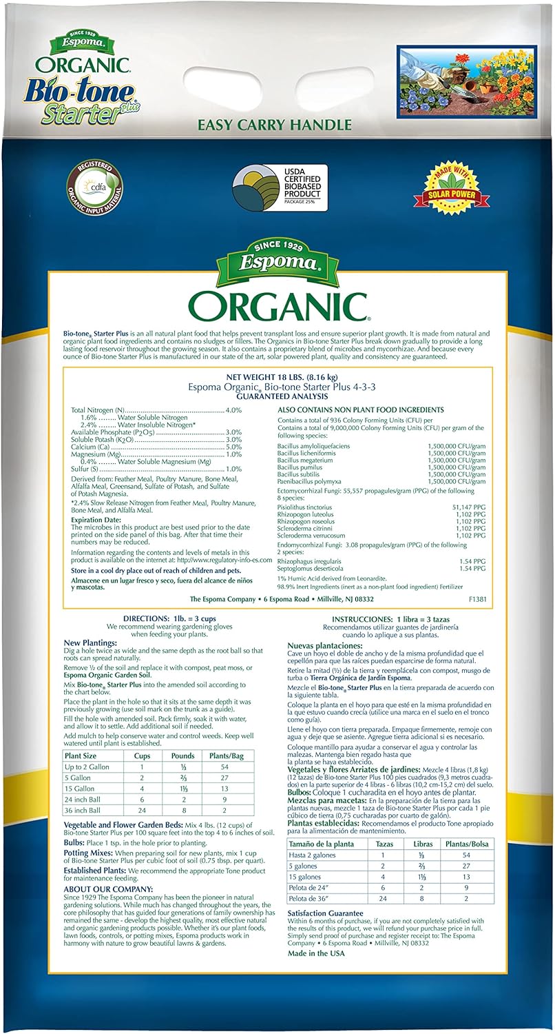 Espoma Bio-tone Starter Plus 18 lb is your go-to transplant fertilizer, enriched with both Bio-tone® microbes and Myco-tone® mycorrhizae fungi. Specially designed to reduce transplant shock and encourage healthy root growth, it's perfect for trees, shrubs, flowers, and vegetables.
