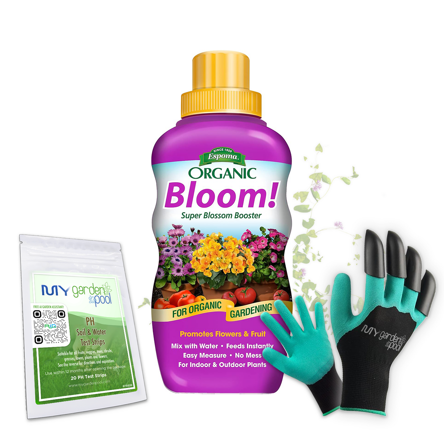 Bloom! 16 oz – Espoma Organic Liquid Plant Food for Flowering Plants – Includes My Garden Pool Claw Gloves & Soil pH Test Strips