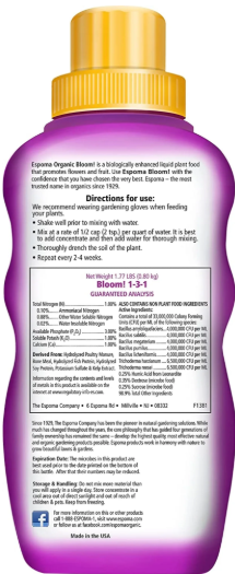 Espoma Bloom! 16 oz is a premium organic liquid fertilizer crafted to enhance flower growth and vibrant blossoms in all types of flowering plants. Designed for easy application, this concentrated formula quickly delivers nutrients right to the roots, promoting fuller blooms and lush color.