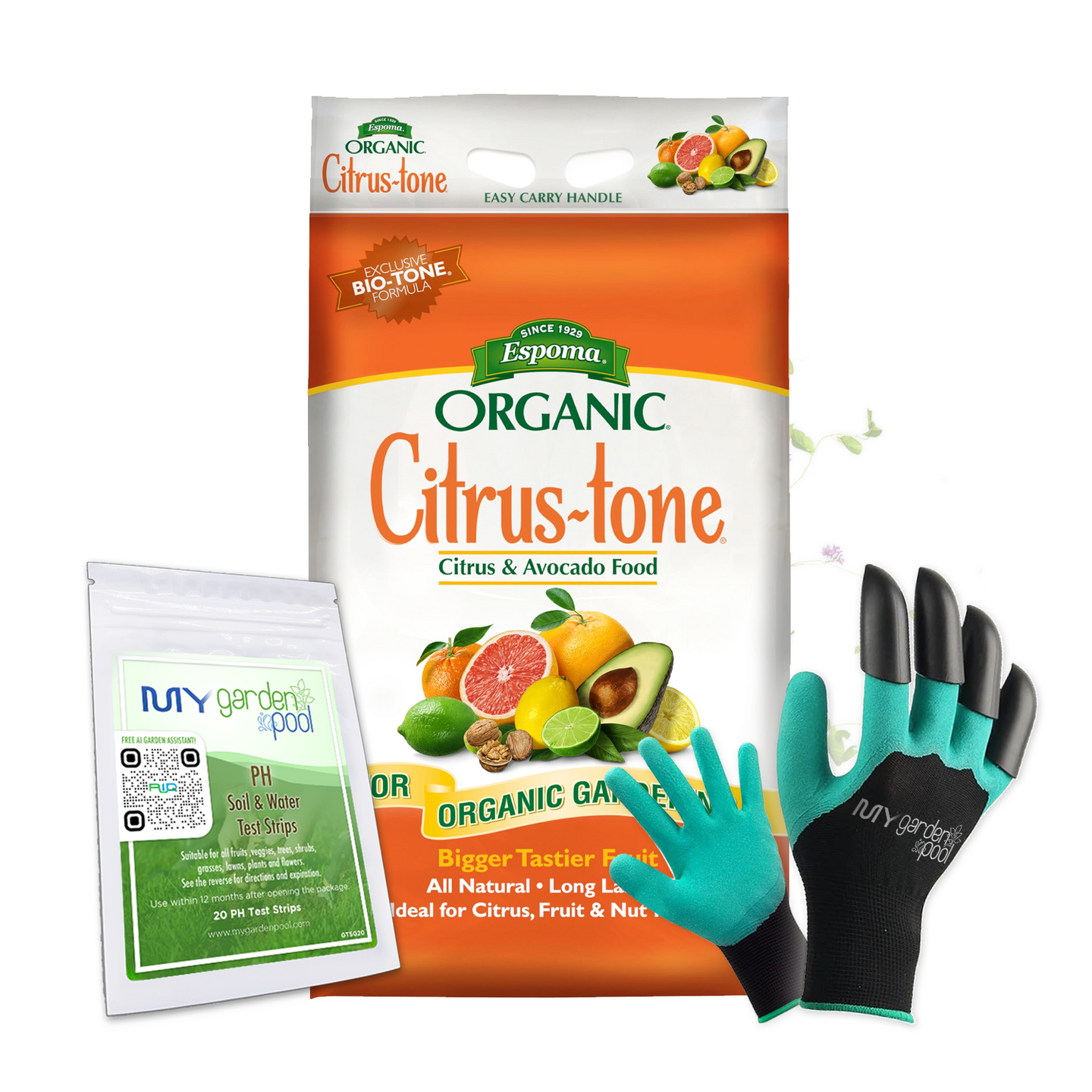 Citrus-tone 18 lb – Espoma Organic Citrus Fertilizer – with My Garden Pool Claw Gloves & Soil pH Test Strips