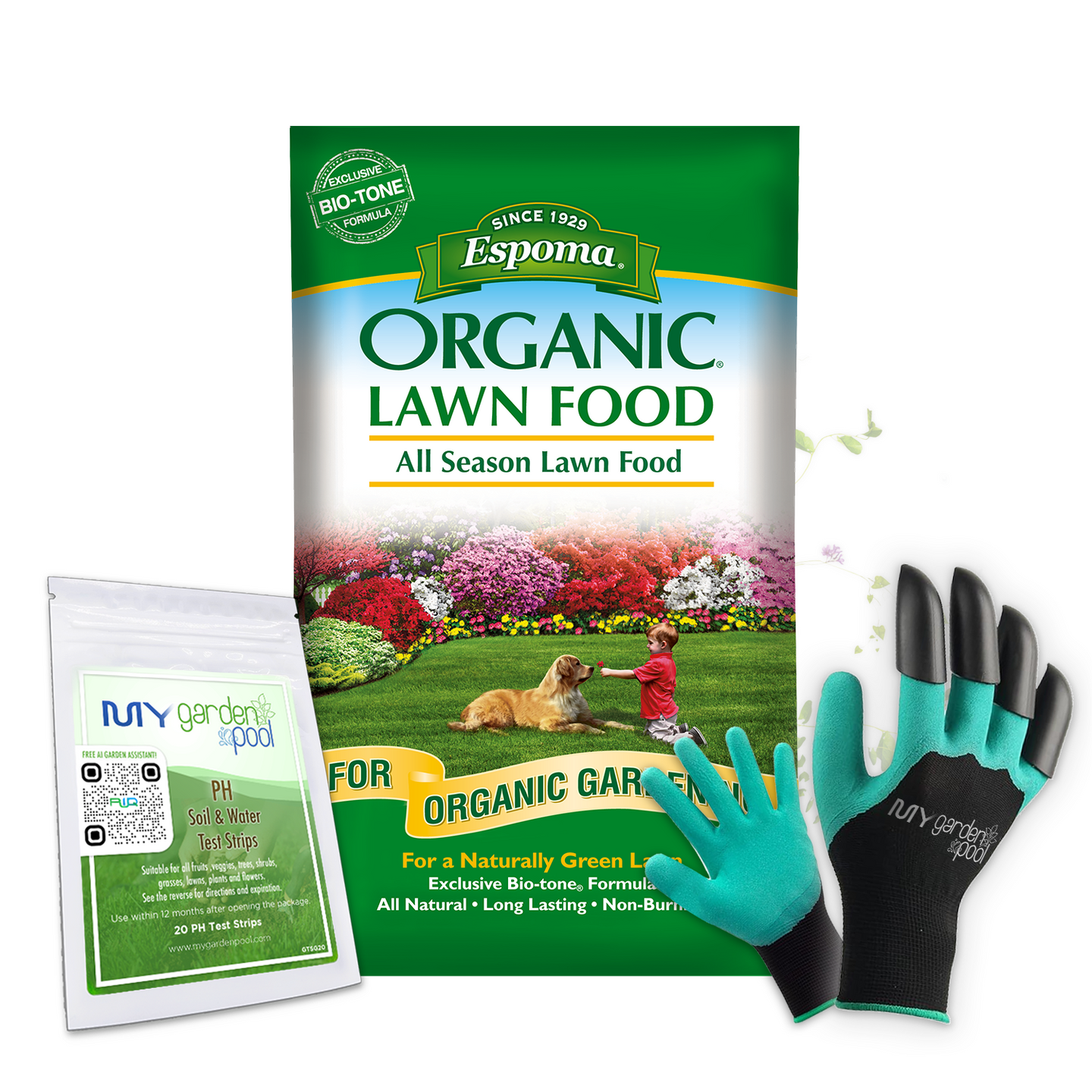 Espoma All Season Lawn Food 28 lb – Organic Lawn Fertilizer 10-0-2 – Includes My Garden Pool Claw Gloves & Soil pH Test Strips