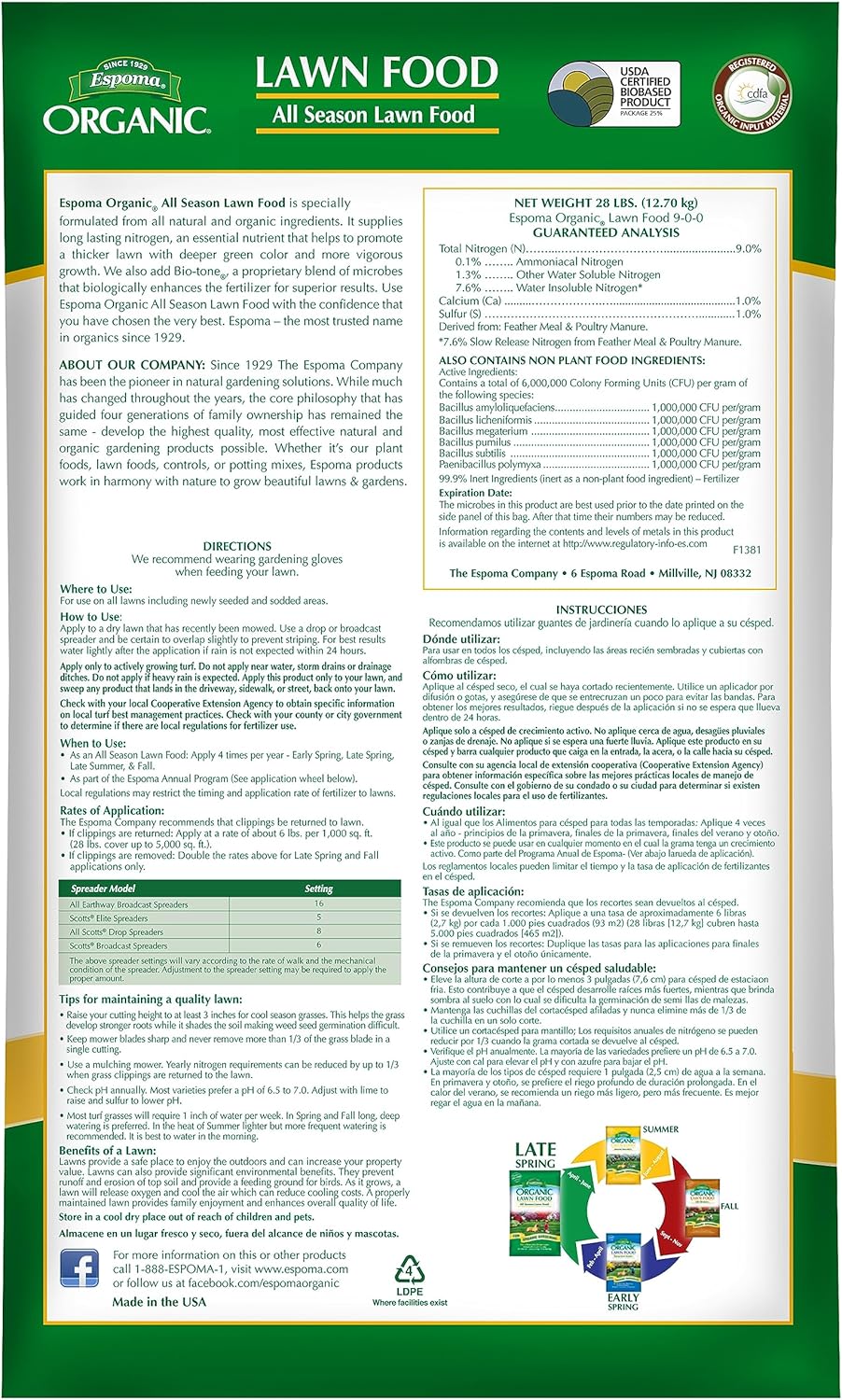 Espoma All Season Lawn Food 28 lb delivers a balanced, slow-release feeding for a healthy, lush lawn from early spring through fall. Formulated with natural organics and fortified with Bio-tone® microbes, this fertilizer promotes deep-root development and thick, green grass.