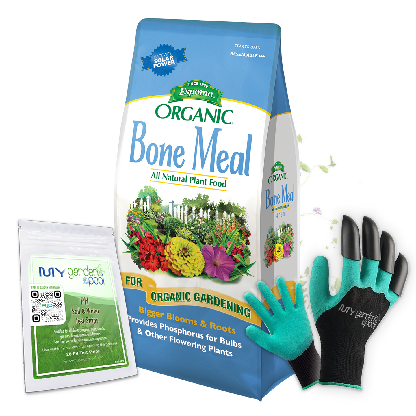 Espoma Bone Meal 24 lb – All-Natural Phosphorus Boost for Bulbs & Perennials – Includes My Garden Pool Claw Gloves & Soil pH Test Strips