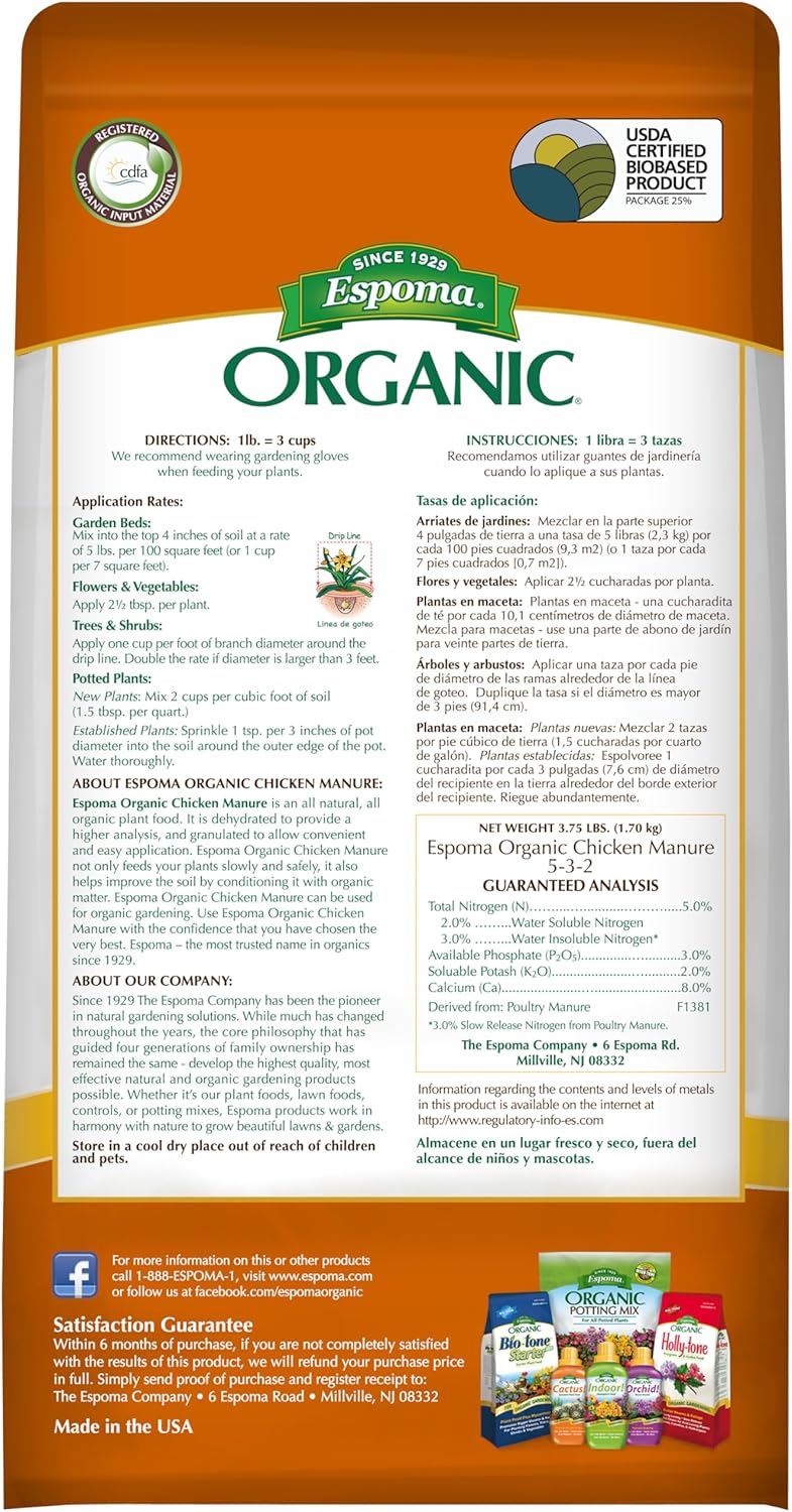 Espoma Chicken Manure 3.75 lb is a compact, nutrient-rich soil amendment perfect for small garden beds, containers, and flower beds. It provides essential nitrogen and organic matter to nourish plants and improve soil structure—naturally and safely.