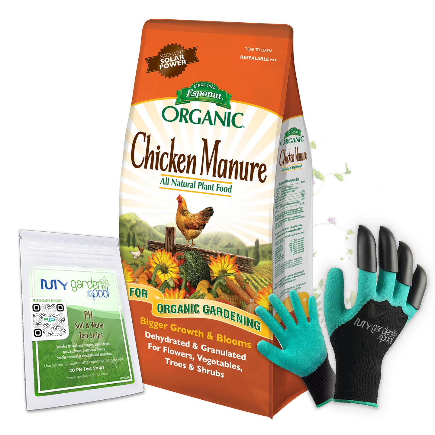 Espoma Chicken Manure 3.75 lb – Organic Soil Conditioner for Gardens – Includes My Garden Pool Claw Gloves & Soil pH Test Strips