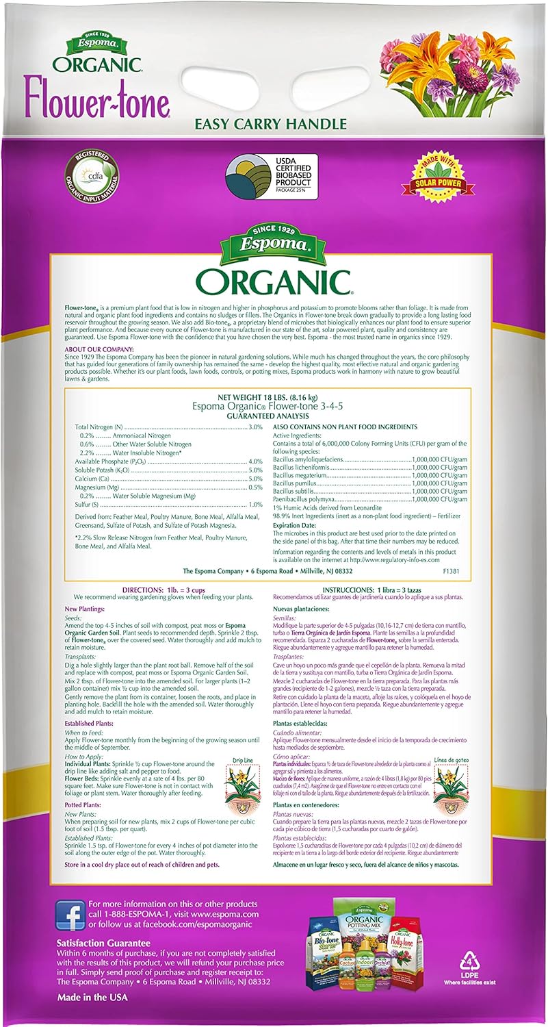 Espoma Flower-tone 18 lb is designed to deliver stunning, long-lasting blooms on all flowering plants. This premium, organic fertilizer features a balanced, slow-release NPK profile plus Bio-tone microbes to enhance root growth and soil health. Your flowers will thank you with vibrant color and more frequent blossoms.