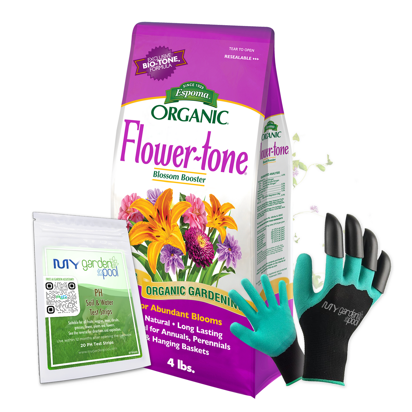 Espoma Flower-tone 4 lb – Bloom Booster Fertilizer + Free Claw Gloves & pH Test Kit
