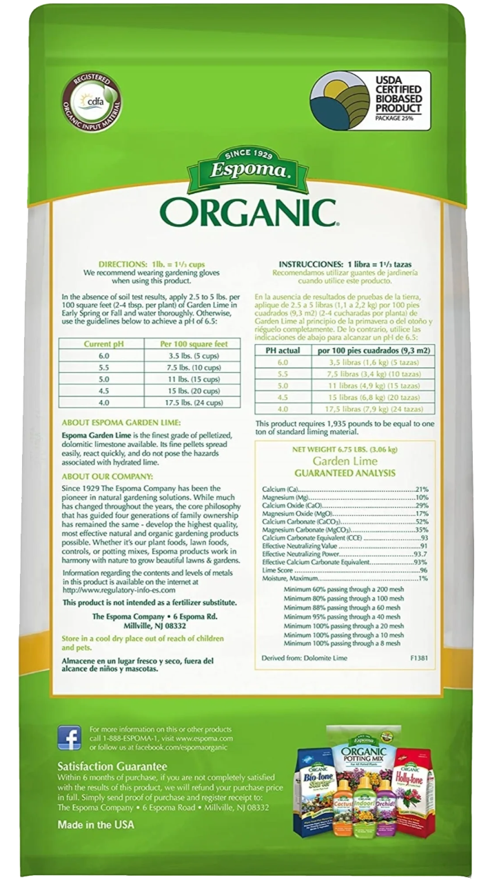 Espoma Garden Lime 5 lb is the natural way to raise soil pH and create a healthier environment for your plants. Made from pure, pelletized dolomitic limestone, it corrects acidic soils, helps release essential nutrients, and promotes robust plant growth. Its easy-to-spread granules make application simple and effective for organic gardens.