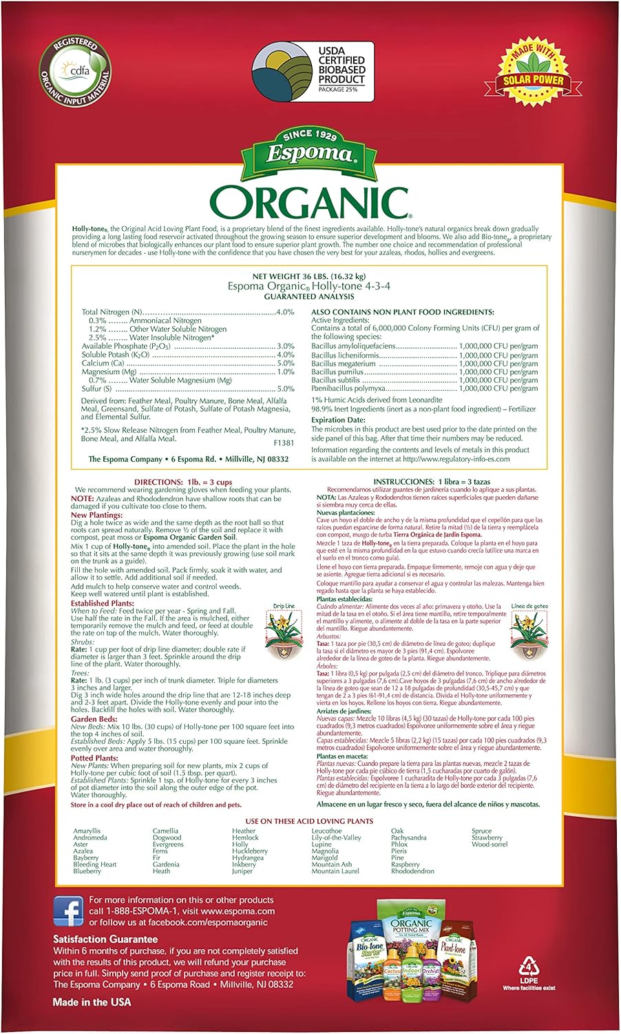 Espoma Holly-tone 36 lb gives your acid-loving plants the nutrition they need for vibrant blooms, healthy roots, and deep green foliage. Enriched with Bio-tone microbes and crafted with natural ingredients, it’s the ultimate choice for gardeners who grow azaleas, camellias, hollies, and evergreens.