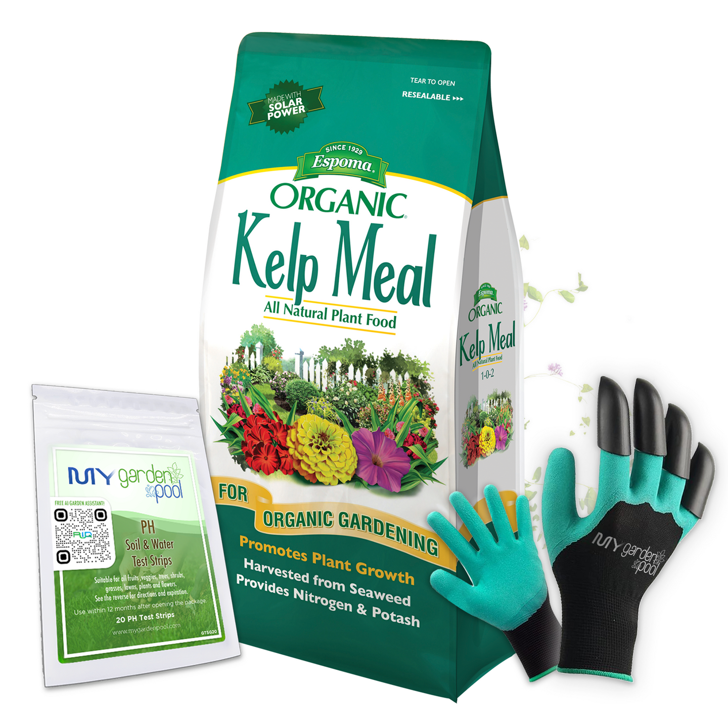 Espoma Kelp Meal 4 lb – Organic Seaweed Fertilizer for Plants & Lawns – Includes My Garden Pool Gloves & Soil pH Test Strips