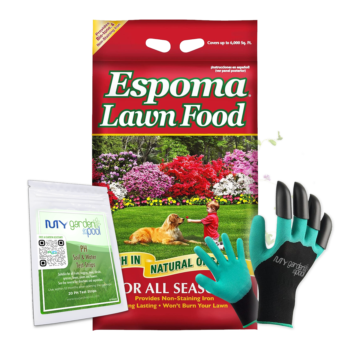 Espoma Lawn Food 15-0-6 – 20 lb Organic Lawn Fertilizer – Includes My Garden Pool Claw Gloves & Soil pH Test Strips