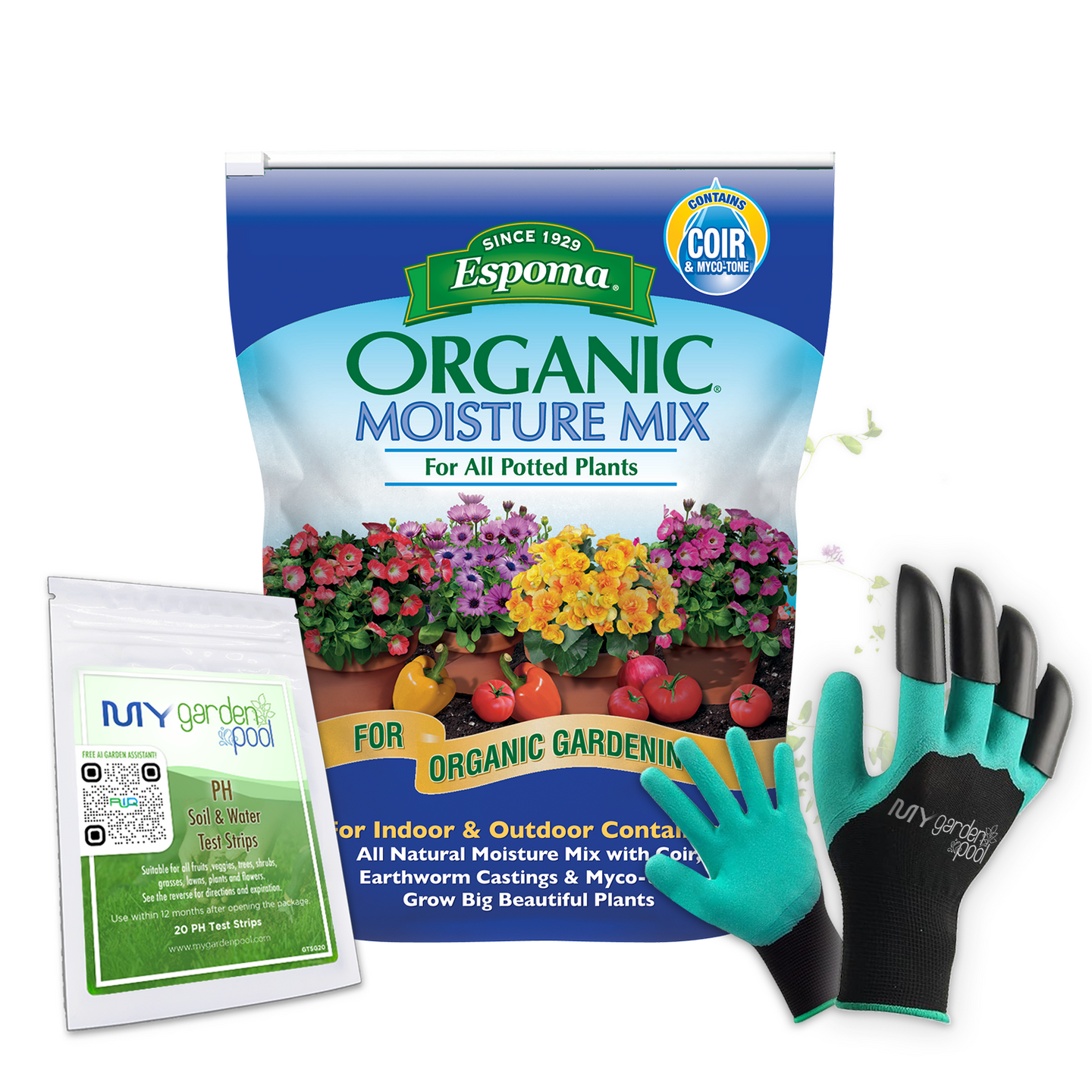 Espoma Organic Moisture Mix 8 qt – Water Saving Potting Soil – Bonus Claw Gloves & Soil pH Test Kit