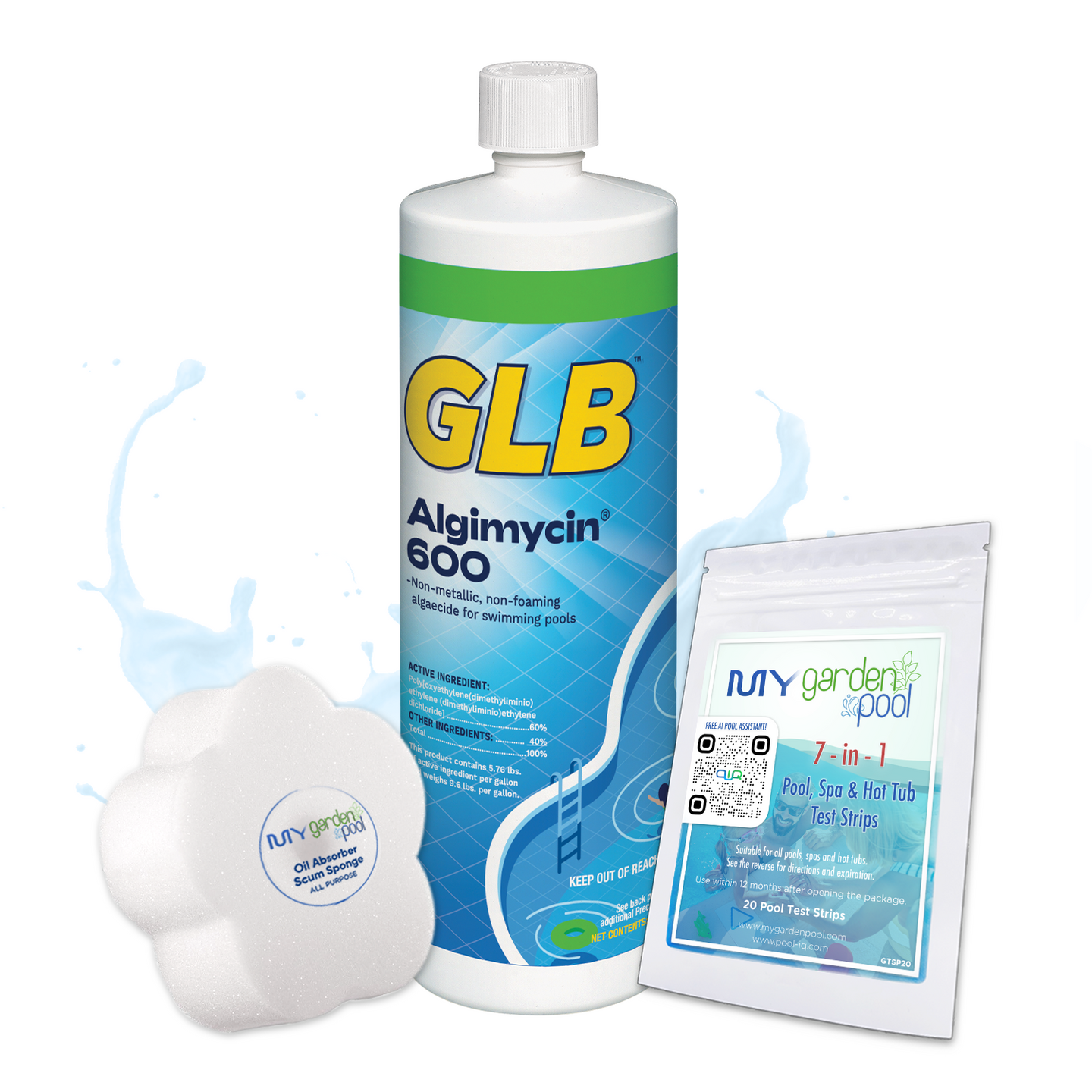 GLB Algimycin 600 32 fl oz – Strong Pool Algaecide – Controls Tough Algae Growth – Includes 2 Scum Socks and 7-in-1 Test Strips