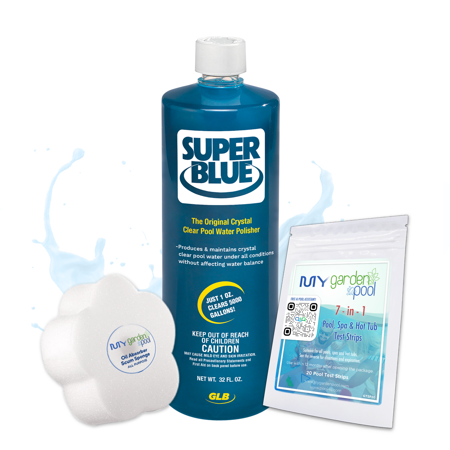 GLB Super Blue 32 fl oz – Premium Pool Water Clarifier – Sparkling Clean Water – Includes 2 Scum Socks and 7-in-1 Test Strips