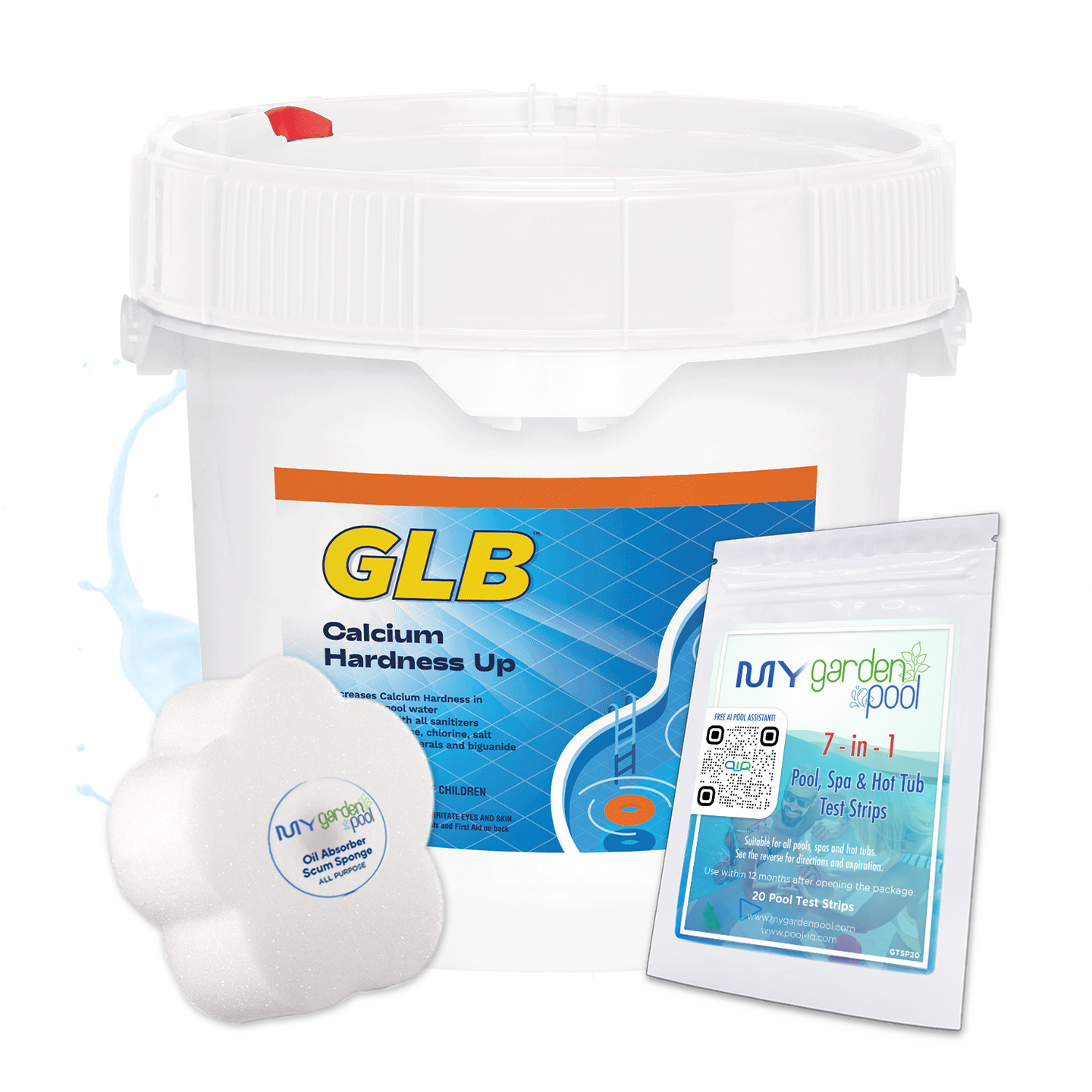 GLB Calcium Hardness Up (pail) 25 lbs – Protects Pool Surfaces – Increases Water Calcium Levels – Includes 2 Scum Socks and 7-in-1 Test Strips