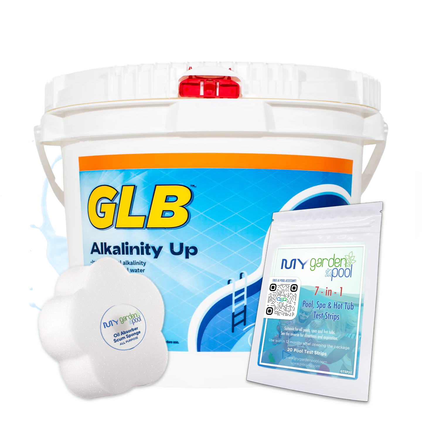 GLB Alkalinity Up 25 lbs – Balances Pool Water Chemistry – Protects Pool Equipment – Includes 2 Scum Socks and 7-in-1 Test Strips