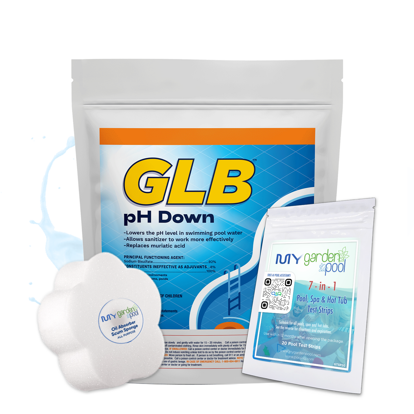 GLB pH Down (bag) 2.5 lbs – Lowers Pool pH Quickly – Balances Pool Water Chemistry – Includes 2 Scum Socks and 7-in-1 Test Strips