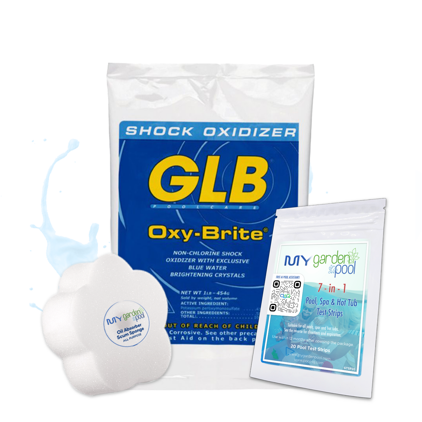 GLB Oxy-Brite 1 lb – Non-Chlorine Pool Shock – Gentle Water Oxidizer – Includes 2 Scum Socks and 7-in-1 Test Strips