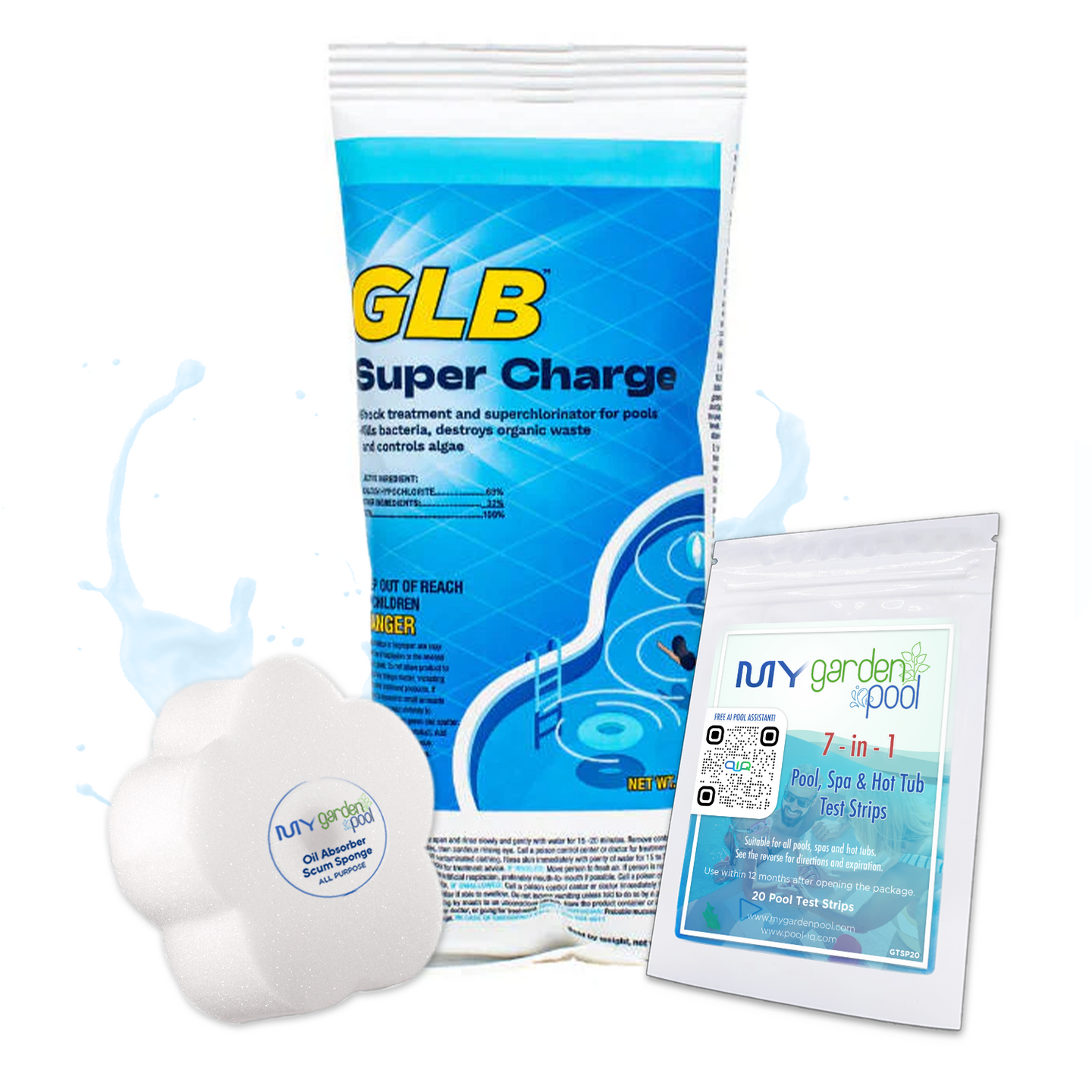 GLB Super Charge Shock 1 lb – Rapid Pool Water Sanitizer – Fast Chlorine Boost – Includes 2 Scum Socks and 7-in-1 Test Strips
