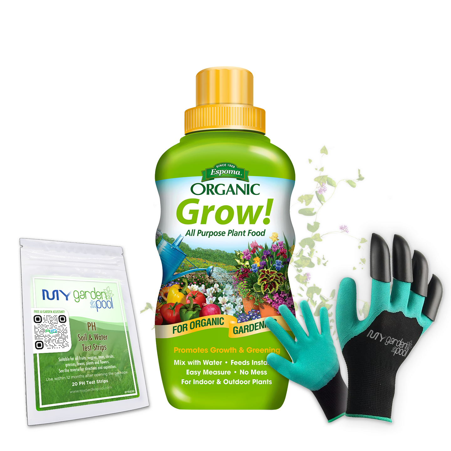 Grow! 16 oz – Espoma Organic Liquid Plant Food for All-Purpose Growth – Includes My Garden Pool Claw Gloves & Soil pH Test Strips