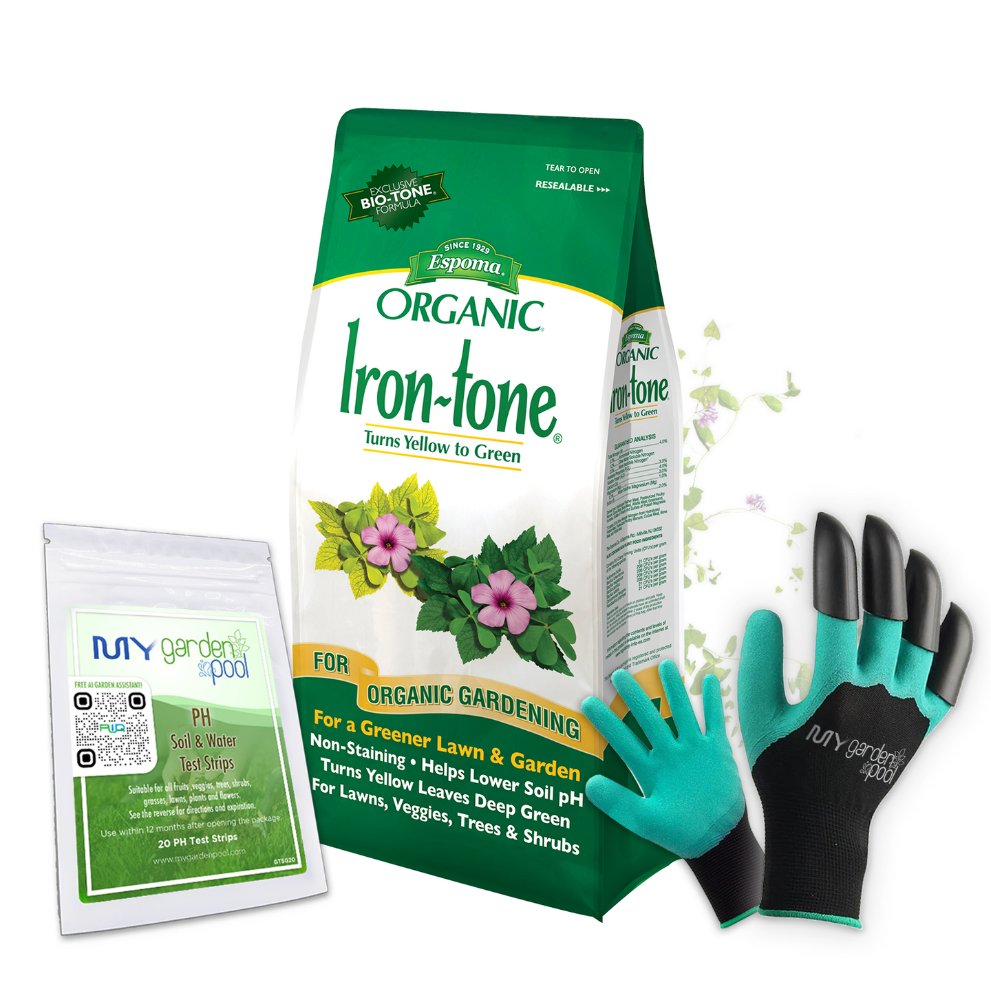 Iron-tone 20 lb – Espoma Organic Iron Supplement for Lawns & Plants – Includes My Garden Pool Claw Gloves & Soil pH Test Strips