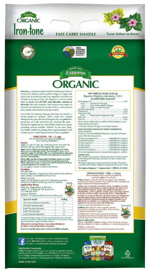 Espoma Iron-tone 20 lb is a premium organic iron supplement designed to correct and prevent chlorosis (yellowing leaves) in lawns, shrubs, trees, and garden plants. With a slow-release, non-staining formula, Iron-tone delivers long-lasting, gentle results without burning.