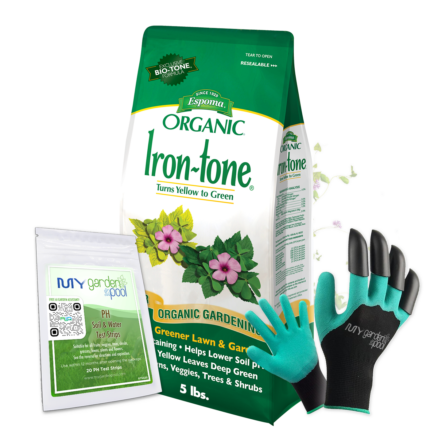 Iron-tone 5 lb – Espoma Organic Iron Supplement for Plants & Turf – Includes My Garden Pool Claw Gloves & Soil pH Test Strips