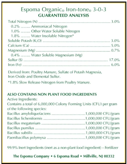 Espoma Iron-tone 5 lb is your go-to organic iron supplement for all plants and turf grasses suffering from iron deficiency. Whether it’s yellowing leaves or lackluster lawns, Iron-tone revives color safely and effectively without staining or burning.