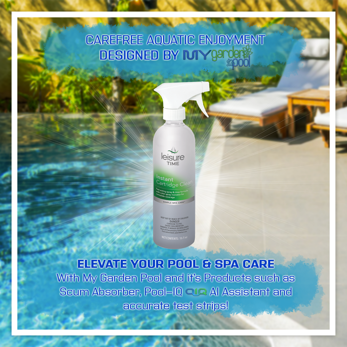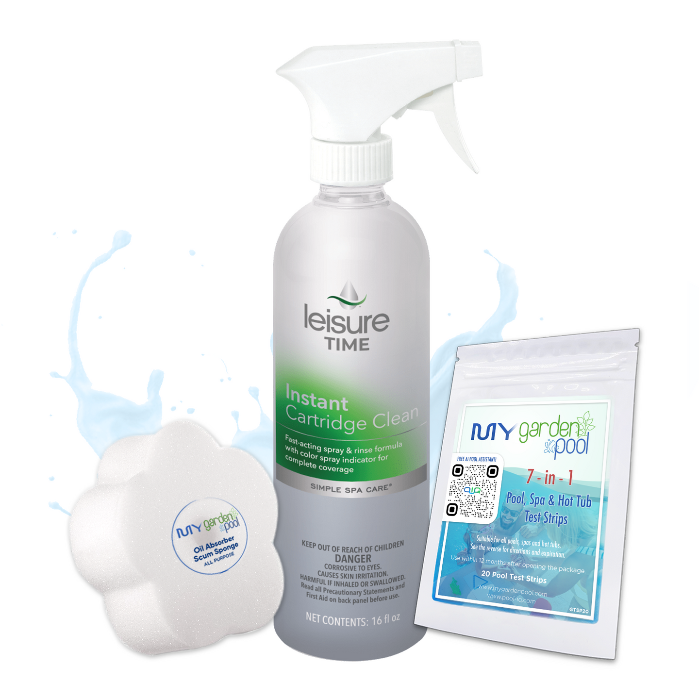 Clean your spa filters instantly and effectively with Leisure Time S Instant Cartridge Clean. This powerful spray cleaner is designed to remove oils, dirt, and debris from cartridge filters, improving water flow and extending filter life. Every purchase includes complimentary My Garden Pool 20 Ct. Test Strips and a Flower Oil-Absorbing Scum Sponge, ensuring you have the tools to maintain crystal-clear spa water.