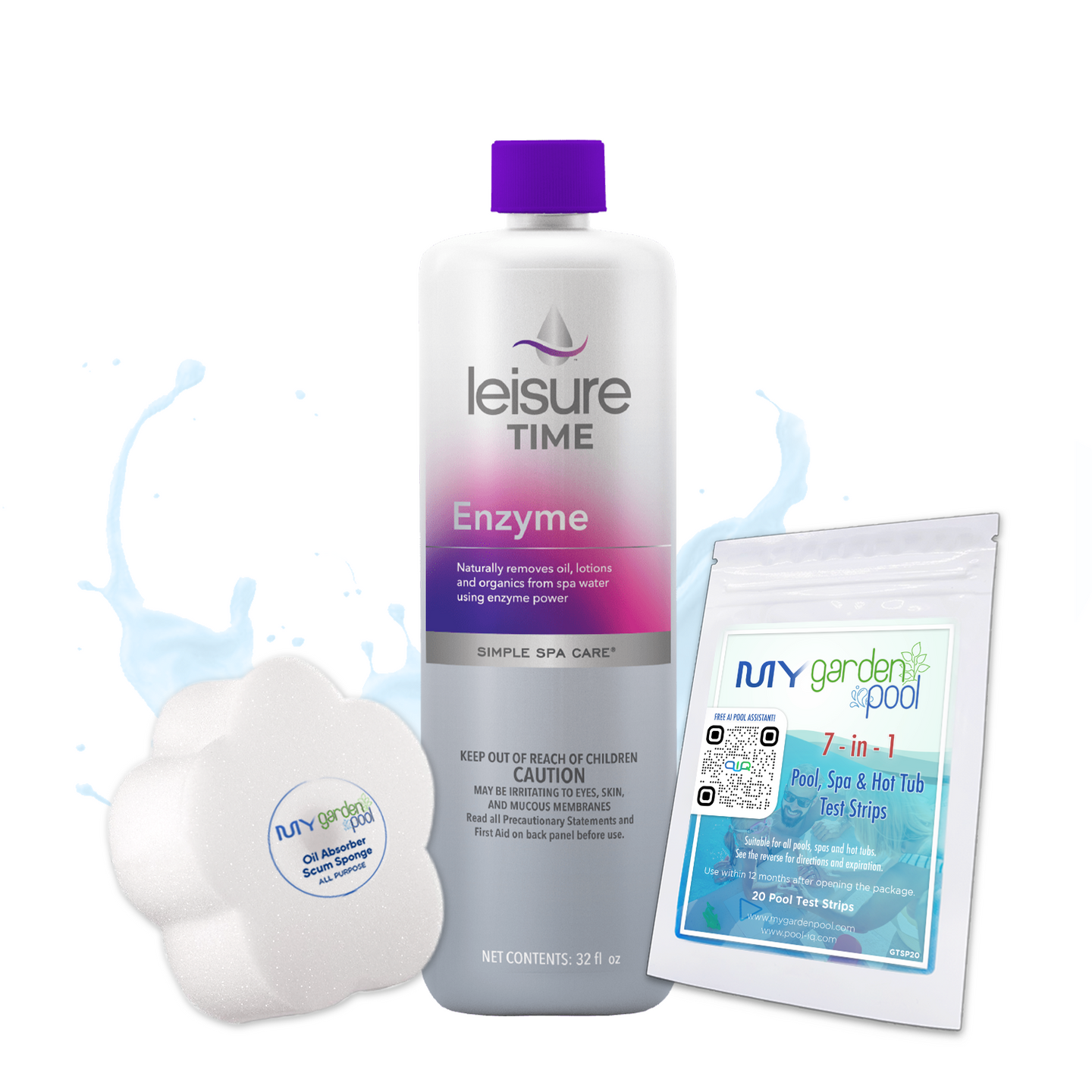 Maintain your spa water effortlessly with Leisure Time SGQ Enzyme, a powerful solution designed to break down oils, lotions, and organic waste in spa water. Plus, every purchase includes a My Garden Pool 20 Ct. Test Strips and a Flower Oil-Absorbing Scum Sponge, making it easier to monitor water quality and eliminate unwanted oils.