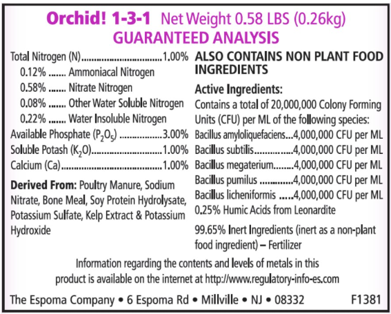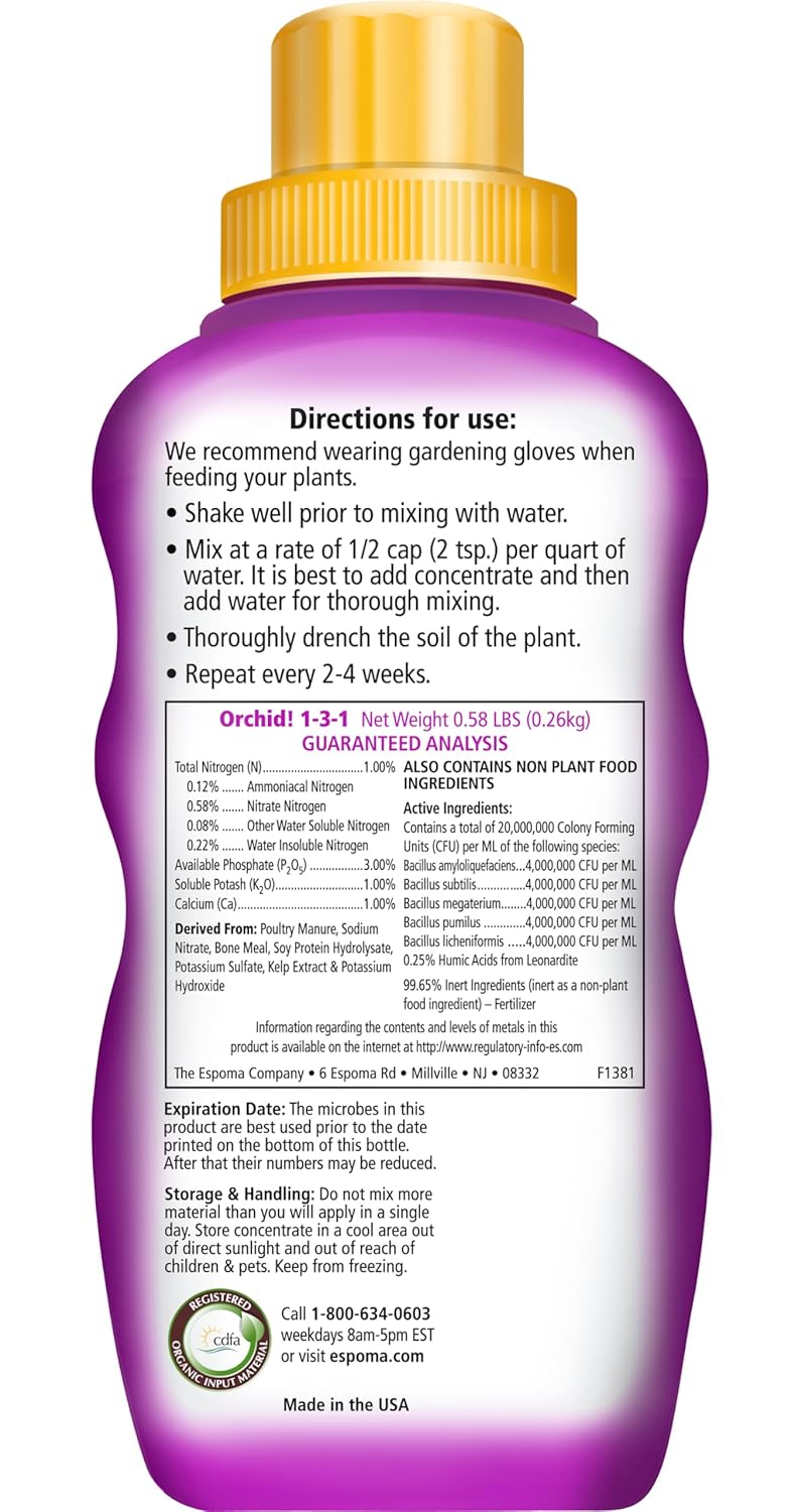 Espoma Orchid! 8 oz is a premium liquid organic fertilizer formulated specifically for orchids and other tropical blooming plants. Gentle and effective, it enhances root strength, flower production, and overall plant vitality without risking root burn.