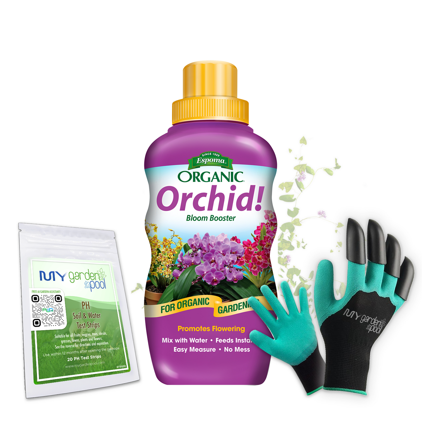 Orchid! 8 oz – Espoma Organic Orchid Fertilizer – Includes My Garden Pool Claw Gloves & Soil pH Test Strips