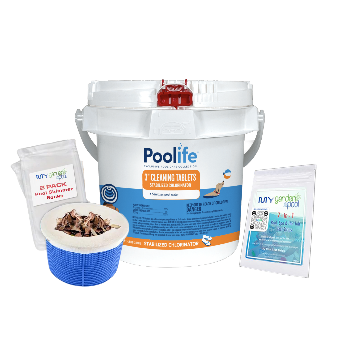 Poolife 3" Cleaning Tablets 4.8 lb – Stabilized Trichlor Tabs for Long-Lasting Sanitation – Includes 2 Scum Socks and 7-in-1 Test Strips
