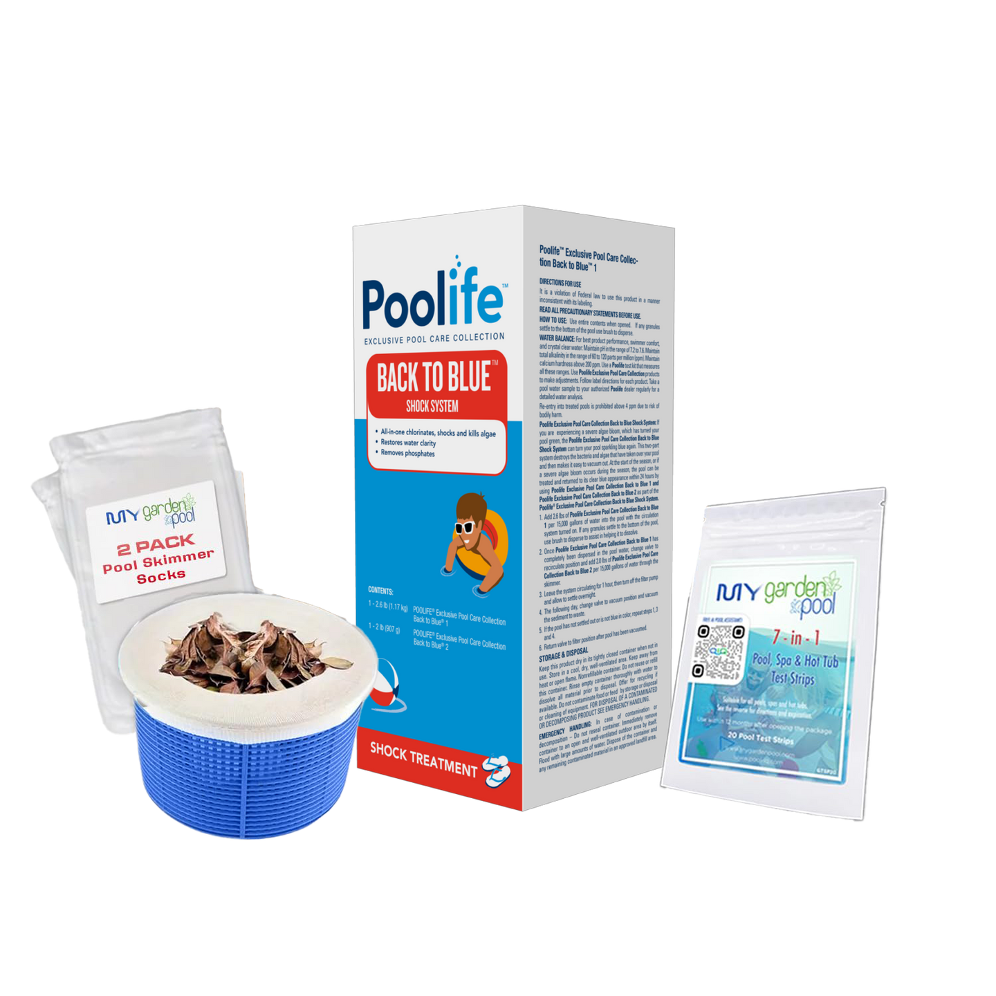 Poolife Back to Blue 1 Kit – Powerful 2-Part Pool Treatment – Clears Severe Cloudy or Green Water – Includes 2 Scum Socks and 7-in-1 Test Strips