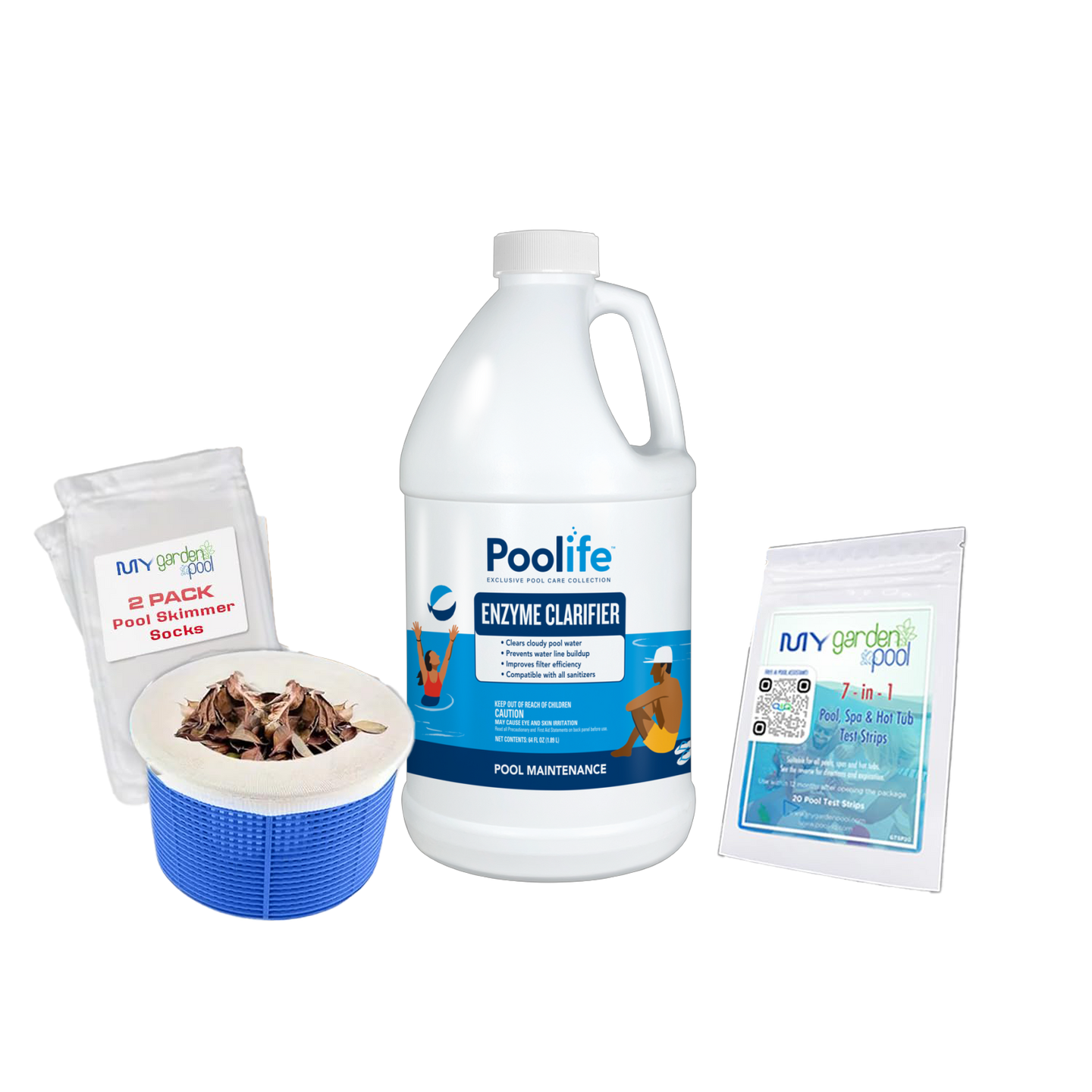 Poolife Enzyme Clarifier 64 fl oz – Breaks Down Oils & Lotions – Crystal-Clear Water Weekly Maintenance – Includes 2 Scum Socks and 7-in-1 Test Strips