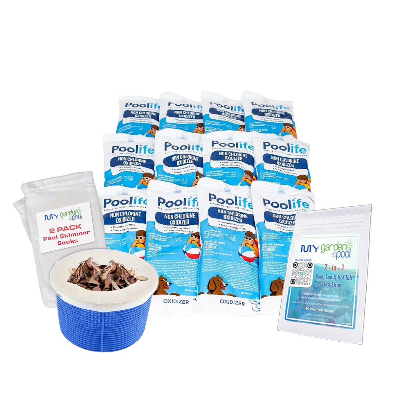Poolife Non-Chlorine Oxidizer 12 Pack (1 lb each) – Ideal for Bromine Pools – Weekly Pool Shock – Includes 2 Scum Socks and 7-in-1 Test Strips