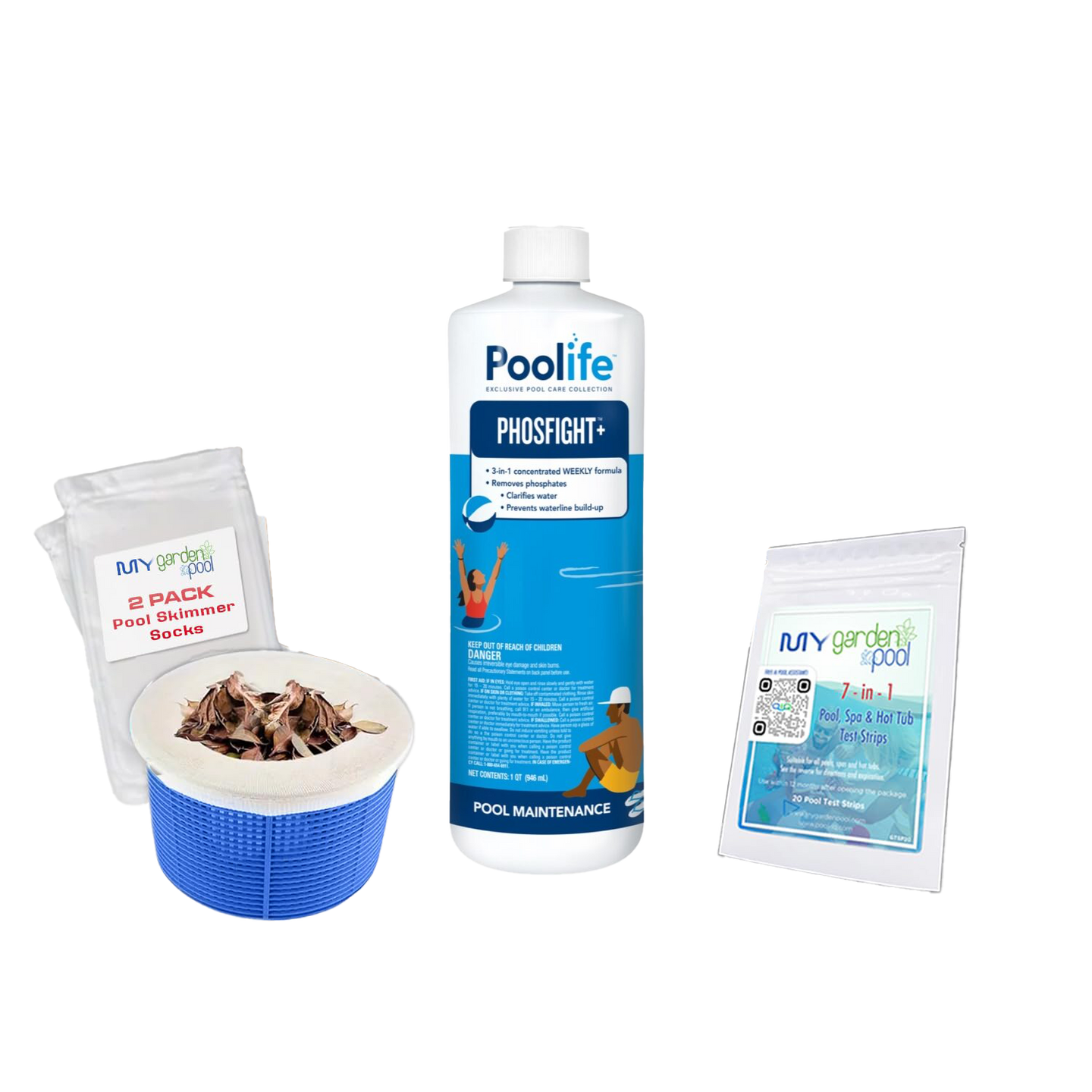 Poolife PhosFIGHT Plus 32 fl oz – Phosphate Remover for Pools – Prevents Algae Growth – Includes 2 Scum Socks and 7-in-1 Test Strips