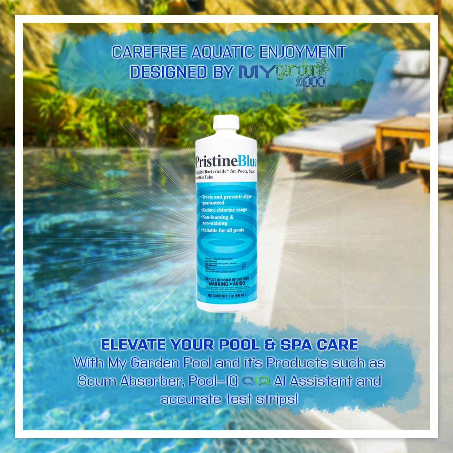 Includes My Garden Pool Test Strips and Scum Sponge