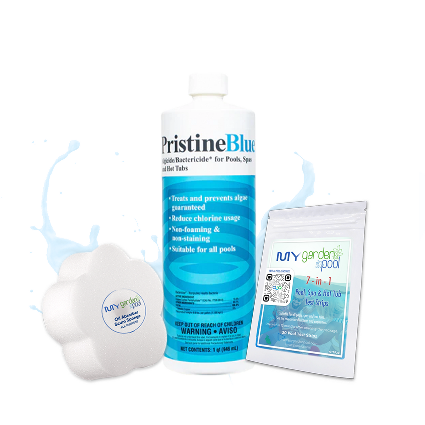 Includes My Garden Pool 20 Ct. Test Strips & Scum Sponge for complete water care and maintenance.