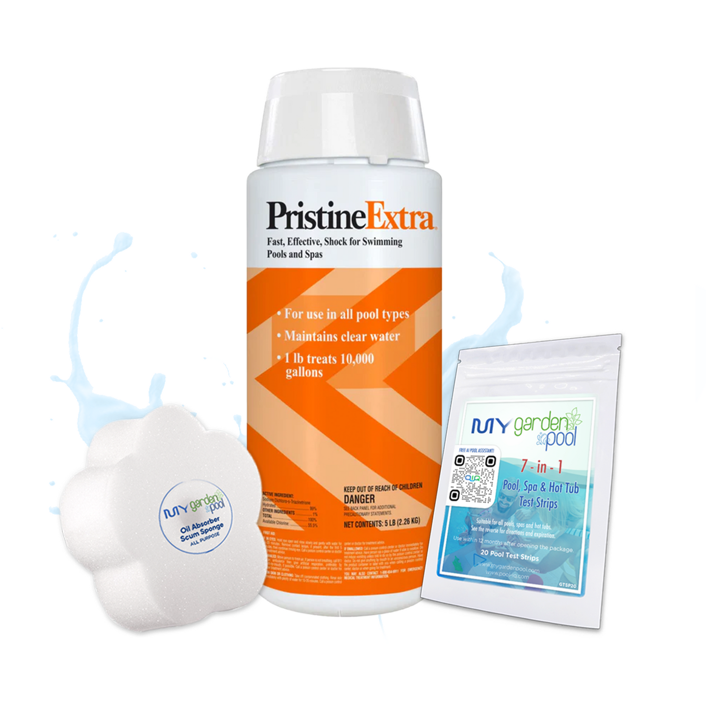 PristineExtra 5 lbs – Heavy-Duty Spa and Pool Oxidizer – Removes Organic Contaminants – Includes Scum Sponge, Flower Oil-Absorbing Sponge, and 7-in-1 Test Strips