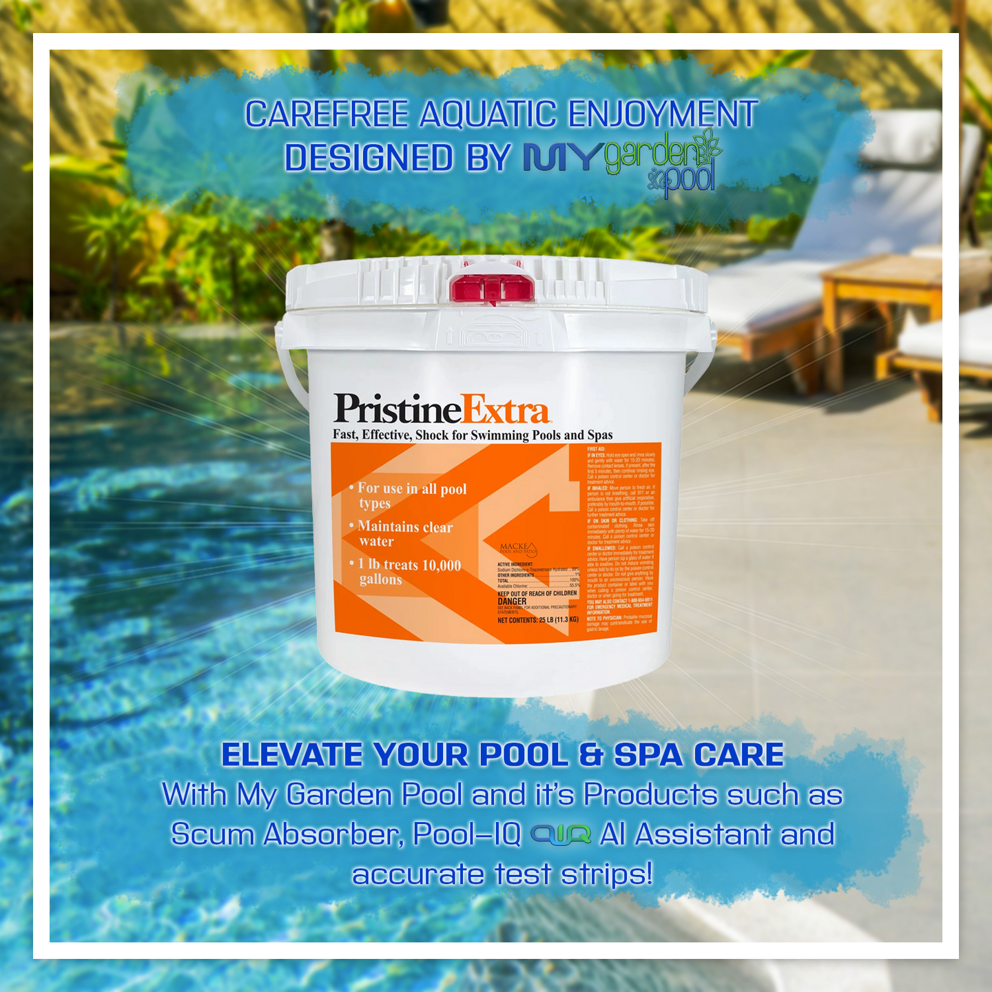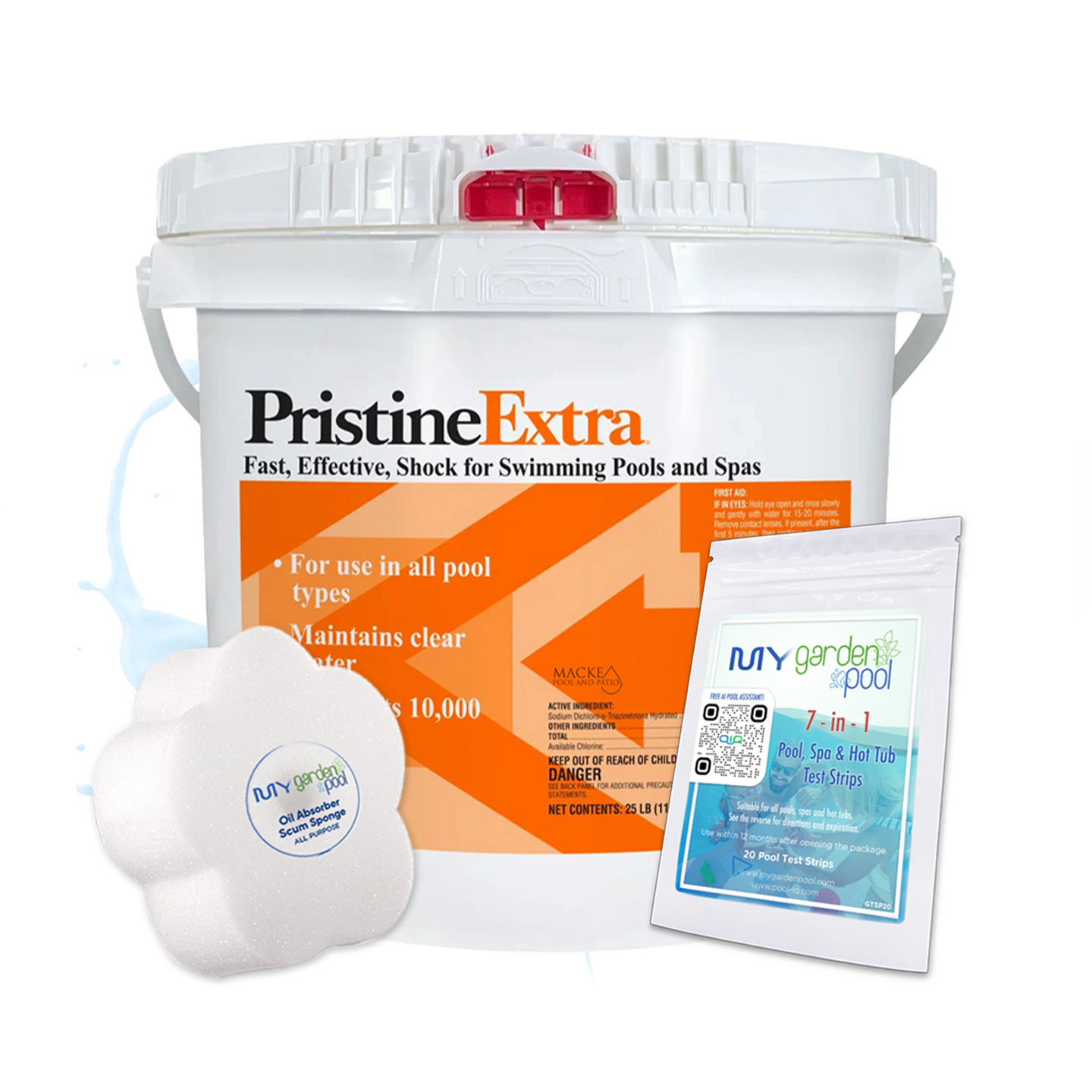 PristineExtra 25 lbs – Bulk Oxidizer for Pools and Spas – Maintains Sparkling Water – Includes Scum Sponge, Flower Oil-Absorbing Sponge, and 7-in-1 Test Strips
