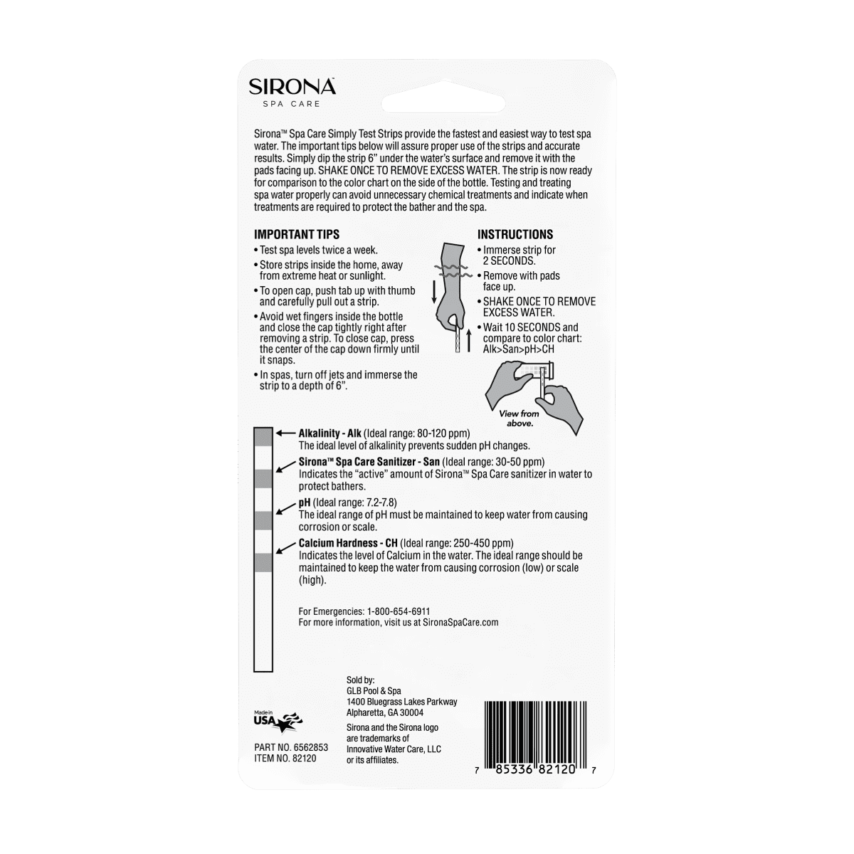 Sirona Chlorine and Bromine Test Strips make spa and pool maintenance easy. With simple dip-and-read technology, these strips provide quick, accurate results for essential water chemistry — helping you maintain a clean and safe spa experience with confidence.