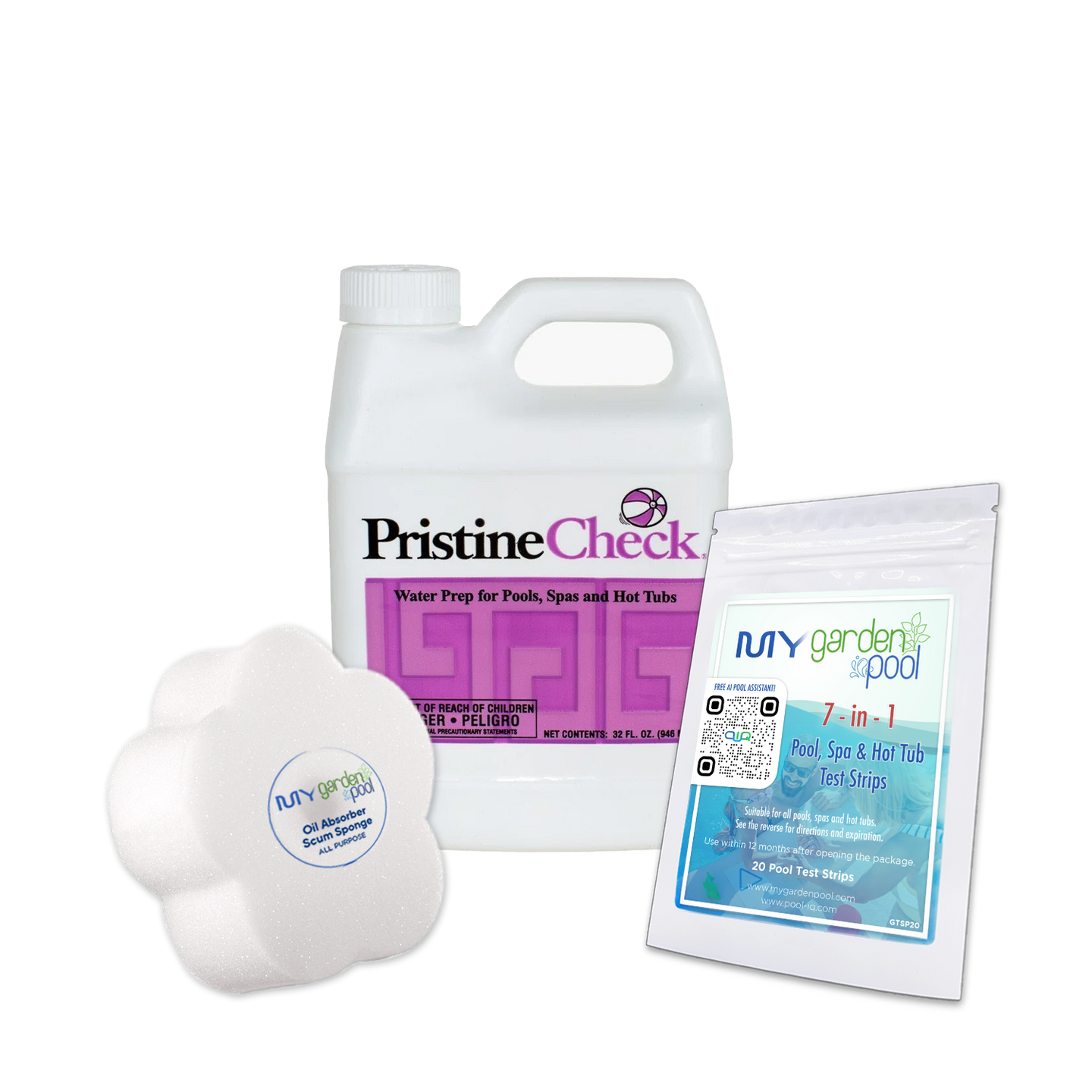 PristineCheck – 32 FL OZ – Pre-Treatment Metal Control with 7-in-1 Test Strips & Scum Sponge