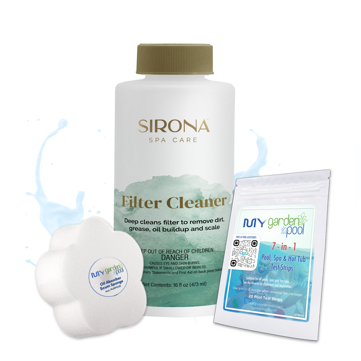 Sirona Filter Cleaner 32 fl oz – Deep Cleaning for Spa Filters – Extends Filter Life – Includes Scum Sponge and 7-in-1 Test Strips