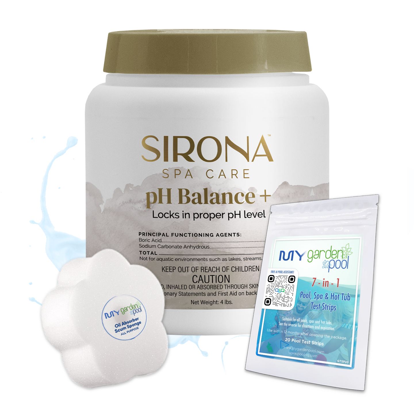Sirona 82136 Spa pH Balance +, 3 LBS with My Garden Pool 20 Ct. Test Strips & Scum Sponge